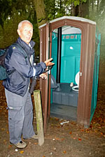 hebben. Een "bouwvakkerstoilet" bij een picknicktafel. Jan: "Eens kijken of hij open is?" En jawel hoor. Het toilet